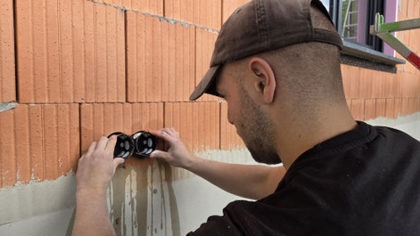 Unsere Monteure haben die Kabelschlitze in die Wände gefräst, die Dosen vorbereitet und die Kernbohrungen gemacht – jetzt werden die Leitungen gelegt.